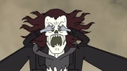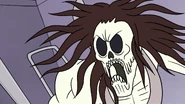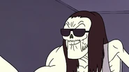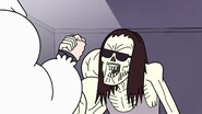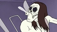 Death represents an undead skeleton-like figure, with a slim body, greenish-white skin flaps. Several skin flaps segment his mandible from his upper jaw (once compared to shredded Parmesan by Rigby), which give the allusion of a mustache and sideburns. He also has very dark brown neck-length hair, and empty eye sockets.