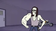 Death's attire is composed of British biker clothes. He wears a black motorcycle jacket, a grey sleeveless shirt, and a torn hoodie around his neck. Both the shirt and the hoodie scarcely hide his rib cage. When he removes his jacket, Death's right arm is shown to be abnormally muscular. His lower body is dressed with a pair of blue jeans tied up with a taupe belt and skull shaped buckle. A small chain is dangling from his left back pocket. On his feet, Death wears a pair of brown leather shoes with pointed tips. On occasion, Death wears sunglasses, a biker's helmet and a knapsack. When on date night, Death wears a grey dress shirt and a black blazer (as seen in "Dead at Eight" and "Play Date").