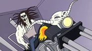 - His appearance may also be influenced by the DC Comics character Lobo, an intergalactic bounty hunter, who dresses similarly, rides a motorcycle-like "spacehog" (which has a skull ornament on the front of it), and has white skin and shoulder-length black hair.