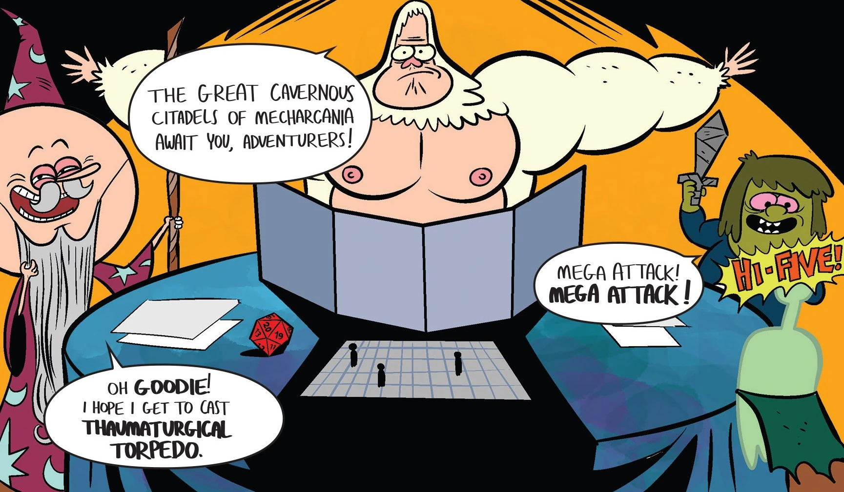 Dungeons & Dummies is the seventeenth short story in the mainline Regular Show Comics series. It was published as a short story in Issue #18, and was written by Jackson Lanzing and Collin Kelly, and illustrated by Derek Charm.