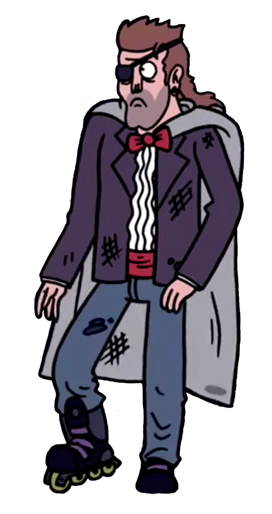 No Rules Man has long, shaggy, brown hair, a gold earring, and an eye-patch covering his bad right eye. He wears a very old tuxedo top with a red bowtie, a cape, and jeans. He uses inline skates to move around.