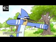 The episode begins outside with Mordecai trying to sling a pizza pouch into Rigby's mouth. But he keeps on missing and pretty soon, the entire house is covered with splattered pizza pouches. An enraged Benson shouts off-screen and runs to them, demanding that Mordecai and Rigby must clean the house, giving them a power washer to do it and using his trademark threat of firing the two if they refuse to do so.