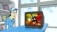 VG appears in "Brain Eraser". Rigby goes to ask him for a copy of Good Cop, Sad Cop, but VG is too addicted to an anime video (Planet Chasers: Starlight Excellent) to answer him. Later on in the episode, he is seen again after Mordecai, Skips, and Rigby erase the image of Pops naked, saying that he doesn't want to go back to reality because he likes the idea of not having to work for the rest of his life. He's voiced by Roger Craig Smith.